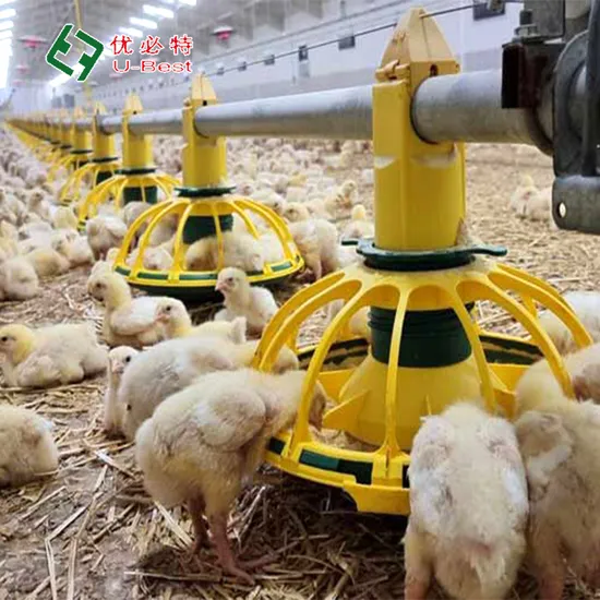 | Pan feeding lines | Feed pipe: Diameter of feed pipe: Φ45mm Material: hot-dip galvanized sheet pipe with >275g/m2 zinc coating amount Helical spring auger: imported from South Africa, feeding ability: 450Kg/h Feed pan: 14 grilles, pan bottom diameter-330mm, material-pure engineering plastic a. Different gears of feed amount, meeting eating demands of different period chickens. b. Accurate and quick to adjust feed flow, the principle is to catch two ears in the inner and pull them out adjust up and down. c. The pan bottom can be disassembled on the ground, which can be used for day-old chicks. d. V-shape plate design can reduce feed storage on bottom, so birds can always eat fresh feed, which also prevents birds staying on the plate for a long time. e. The edge of pan plate tilt towards the center, which avoids waste of feed, the smooth edge prevents birds craws hurting and make sure safe and comfort feeding. Feeding line specification: 4 feed pans/3 meter, 3 feed pans/3 meter |